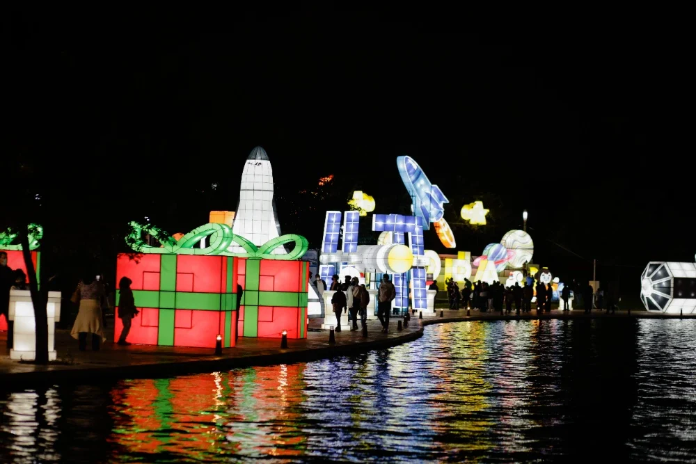 El recorrido comienza en la época dorada de los trenes, con una ambientación inspirada en el estilo Art Deco. Locomotoras, vagones antiguos, relojes monumentales y andenes clásicos te llevarán a través del tiempo. A lo largo del camino, disfrutarás de cientos de figuras luminosas hasta llegar al destino final: el Polo Norte, donde te esperan pinos brillantes, osos polares, pingüinos, la Casa y la Fábrica de Santa, y su emblemático trineo.